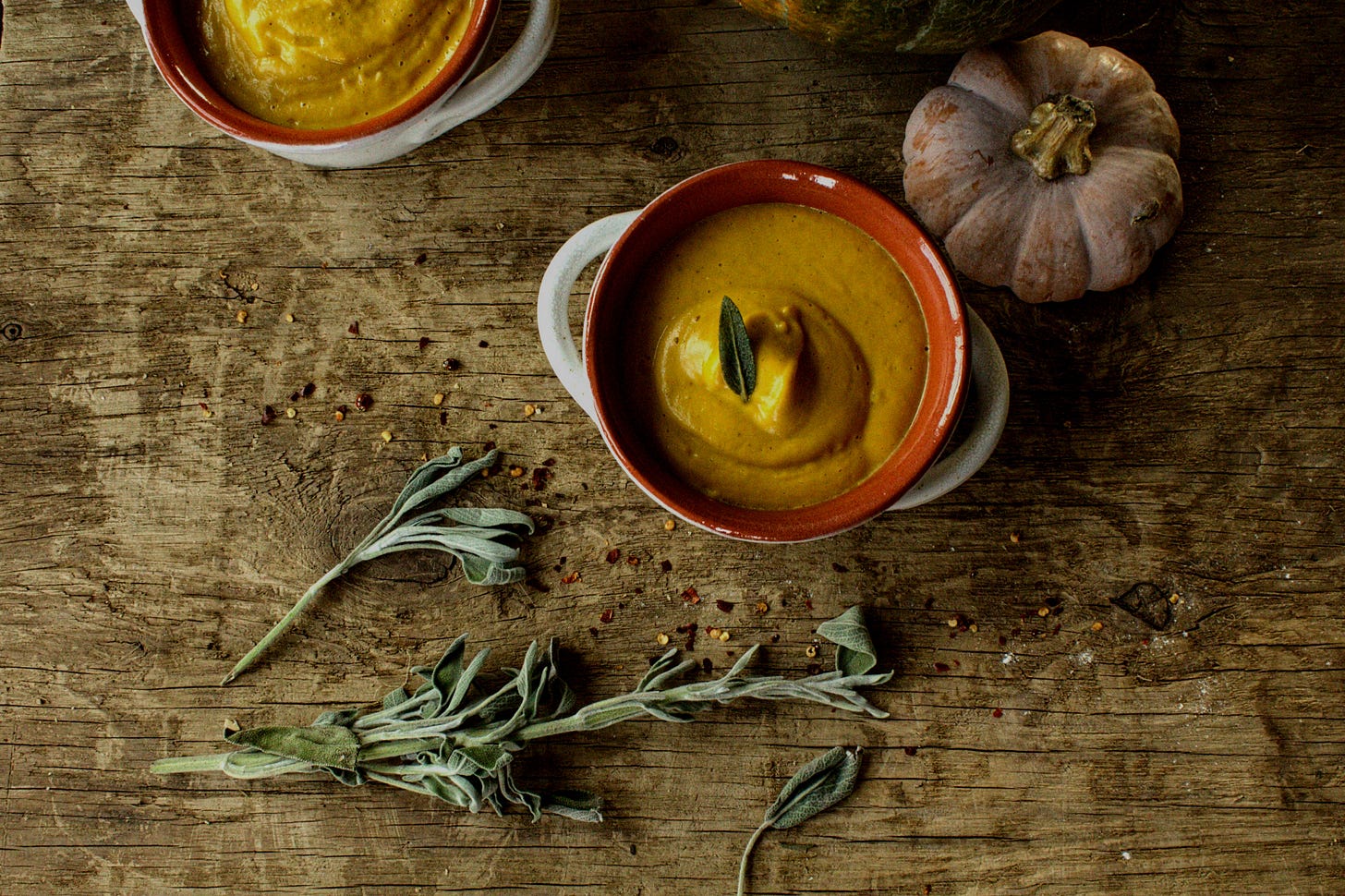 Directions: Over medium heat, add butter and oil to a Dutch oven. When hot, but not smoking, add sage and rosemary. Fry until crispy. Careful not to burn. If burned, start over. Set sage and rosemary aside to cool. Add onion. Cook 5-7 minutes until softened. Add garlic cloves, salt, and red pepper red chili flakes. Cook until fragrant. Crunch the fried sage and rosemary. Discard stems. Add to pot. Add squash puree, oregano, thyme, broth and cream. Bring to a simmer. Simmer for around 15-20 minutes, stirring once in a while. If splattering is a problem, cover with a lid but set to lowest temperature. Blend. Use a blender for an ultra-smooth texture. (I wait for the soup to cool before blending, but you may have a better blender than me). Return to pot to simmer for 15-20 minutes.